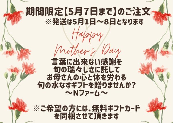 5月7日までの期間限定にはなりますが、ご希望の方には母の日ギフトカード(無料)を同梱させて頂きます。※発送は5月1日~8日までとなりますのでご了承ください。