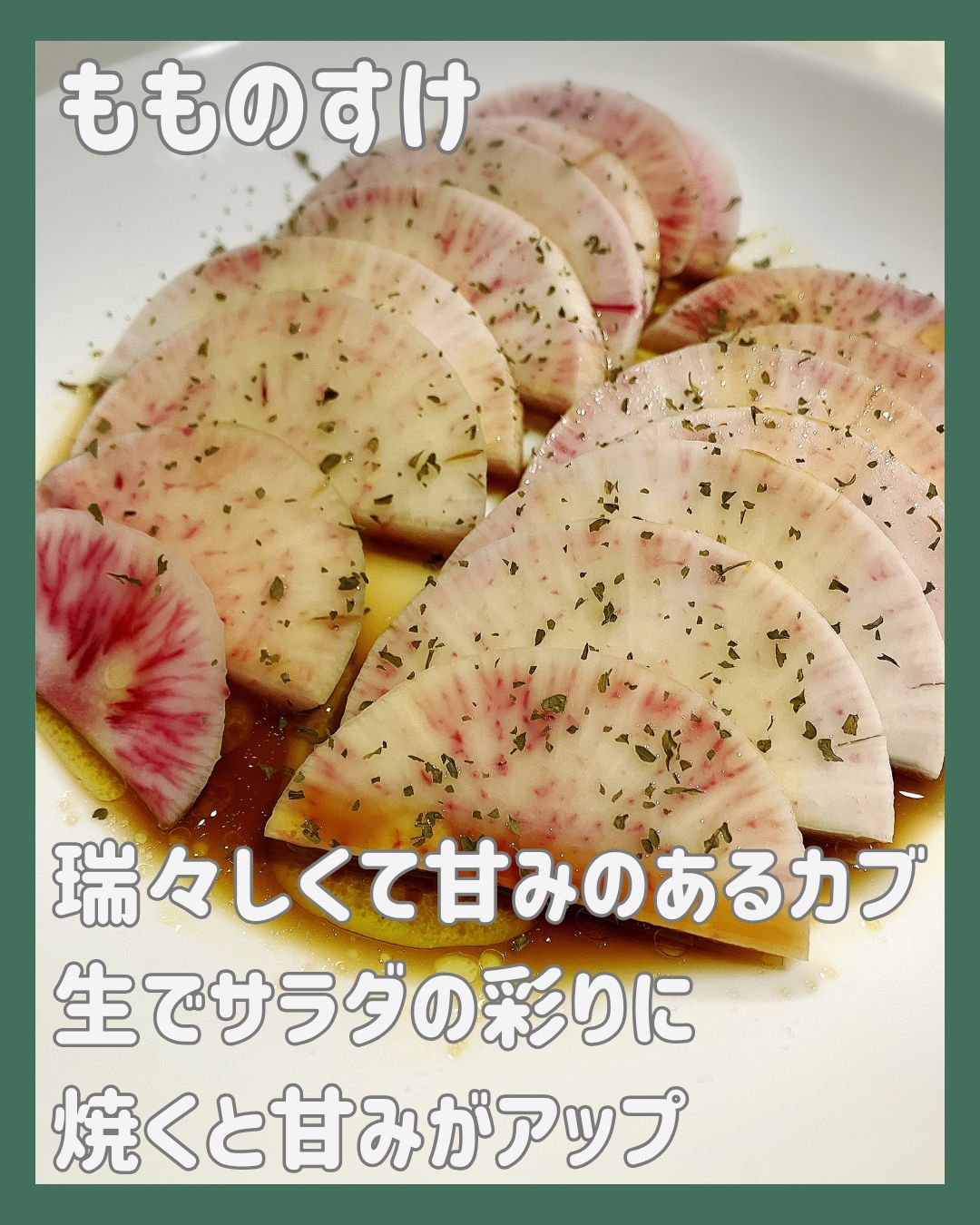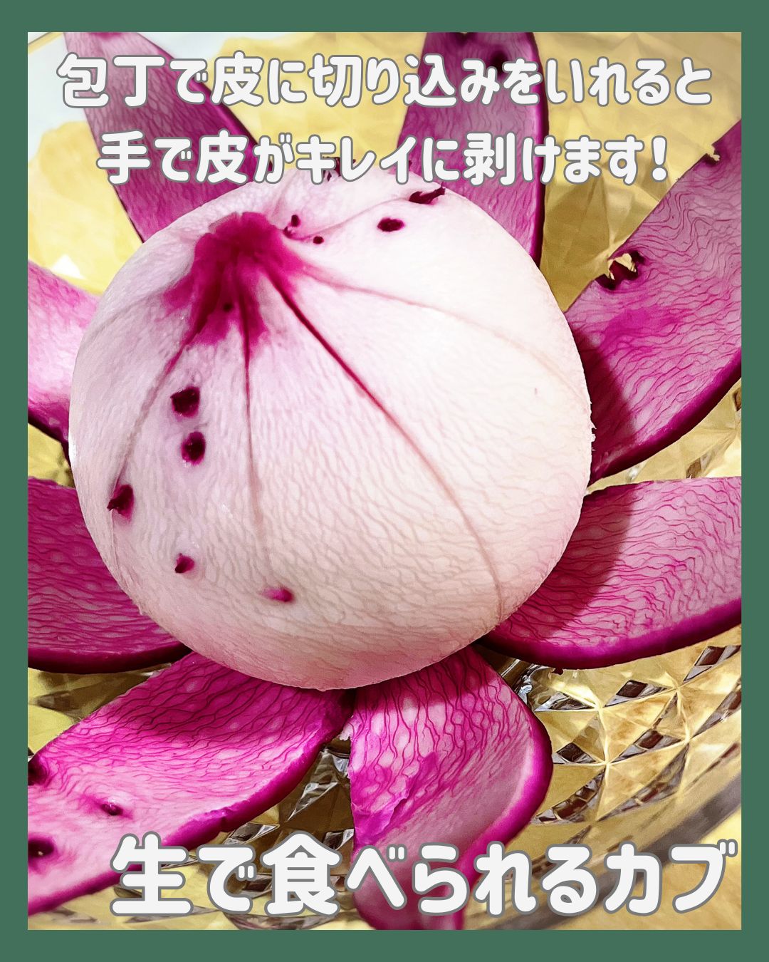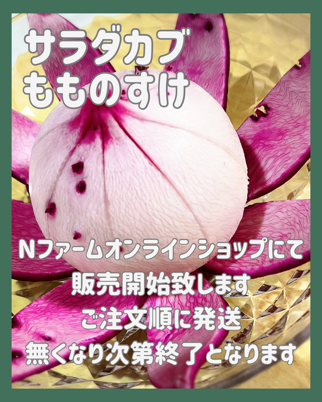 当農園で栽培しているのは、赤かぶの一種である「もものすけ」という品種であまり見かけることは無いかもしれませんが、瑞々しく甘みのあるサラダカブで皮は紅色、皮を剥くとピンク色で食卓を鮮やかに彩ります。