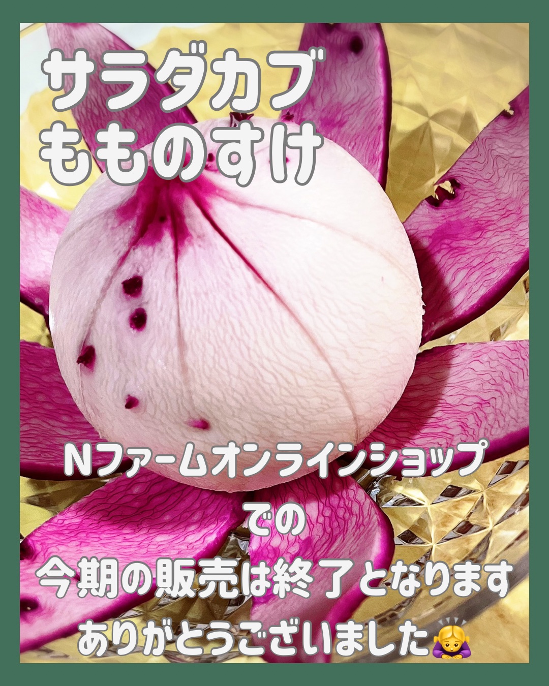 もものすけかぶ販売終了 2025年12月06日 今期の、もものすけかぶ販売終了となります。 Nファームのもものすけかぶをご購入いただいた方々ありがとうございました。 また、販売する物がないオンラインショップの期間に突入してしまいますが…笑 これからも、Nファームオンラインショップを、よろしくお願い致します。 次» 記事コンテンツ